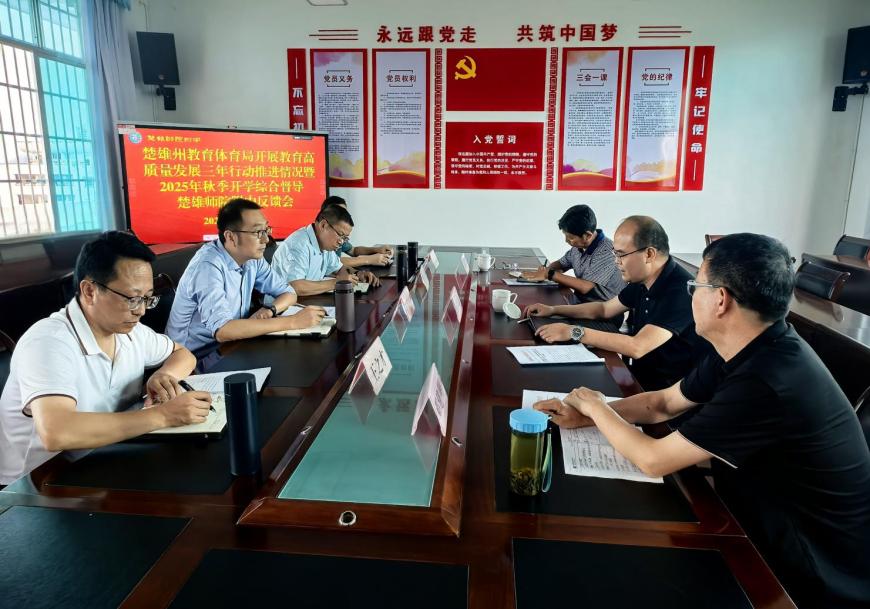 为全面掌握2025年秋季学期学校办学运行状态,确保开学各项工作平稳有序,9月22日下午,楚雄州教体科研所所长杨春德率队莅临我校开展2025年秋季学期开学工作综合督导检查。学校领导及相关部门负责人陪同此次督导检查工作。