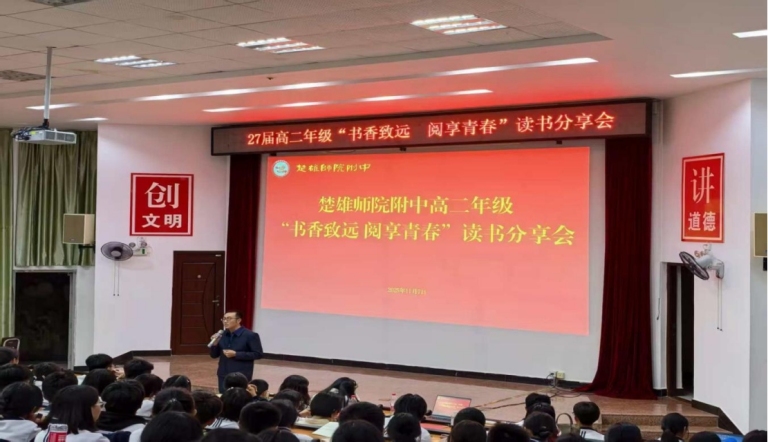 万物裹冬色,山河添新景。为点燃师生阅读热情,共享书香魅力,11月7日晚,楚雄师院附中高二年级在学校报告厅举办“书香致远 阅享青春”读书分享会。爱书人携卷而来、以文会友,共赴一场心灵与智慧交织的盛宴。出席活动的有部分学校领导及高二年级全体师生。高中语文教研组老师担任此次活动评委。