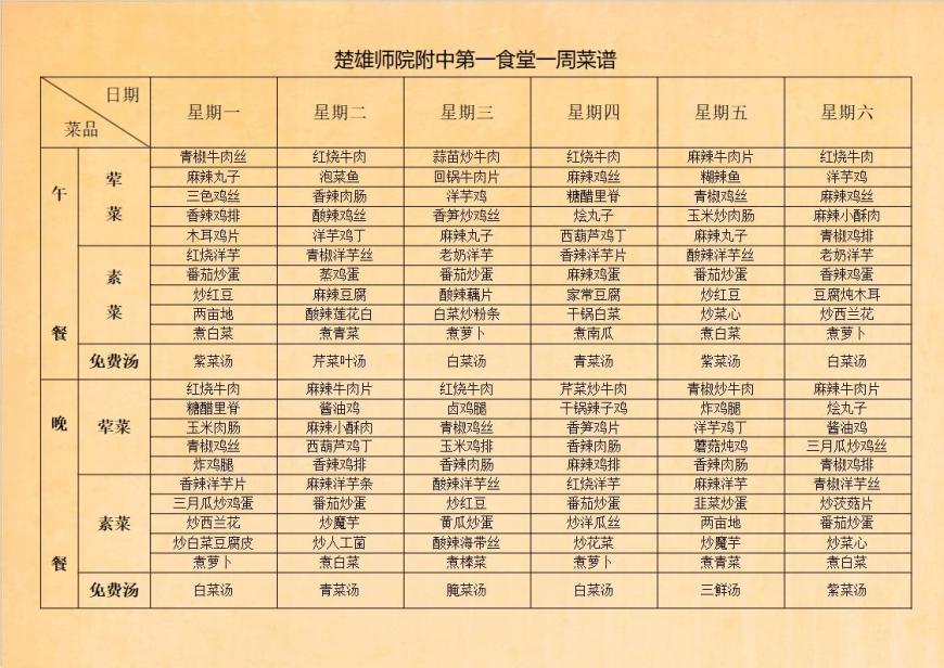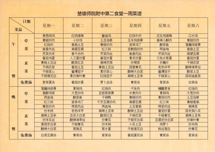楚雄师院附中食堂一周食谱 2025年11月17日——2025年11月22日