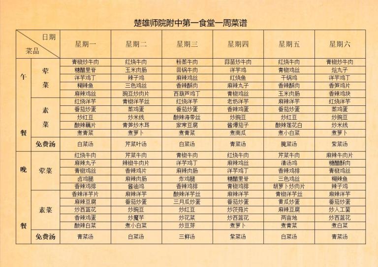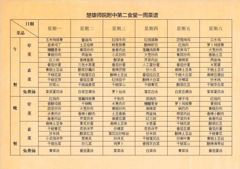 楚雄师院附中食堂一周食谱 2025年12月8日——2025年12月13日