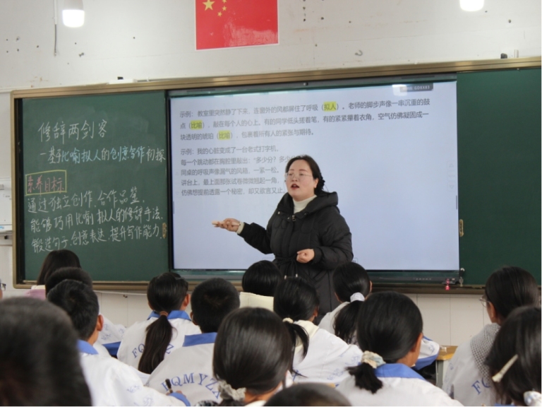 语文教师彭春梅以“修辞两剑客——基于比喻和拟人的创意写作初探”为题,巧妙地将抽象的修辞手法转化为生动有趣的写作实践。课堂上,彭老师通过鲜活的案例和即兴的创作,引导学生打开思路,让文字在比喻与拟人中焕发生机,充分展现了创意写作教学的魅力。