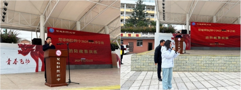 演练总指挥赵学刚校长宣布消防疏散演练正式开始。全校师生反应迅速,沉着冷静,严格按预定路线有序疏散,在指定时间内全部安全撤离至艺术广场集中,整个过程用时2分40秒,展现了良好的应急响应能力和纪律意识。