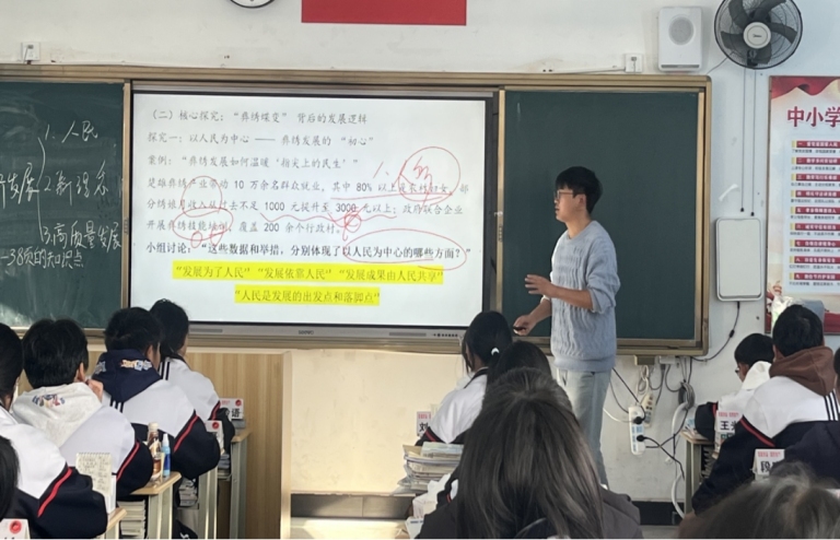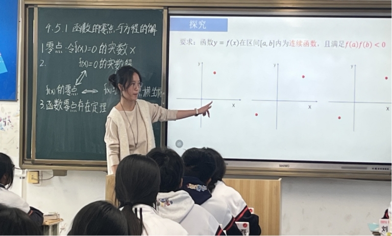 本次活动覆盖高一年级10位青年教师,涉及多学科课堂教学展示。不同学科教师结合学科特点优化教学策略,将课改理念与学科知识深度融合,既保证了课改要求的落实,又彰显了个人教学特色。杨保赛老师的政治课以楚雄彝绣为切入点,将非遗文化与教学内容有机结合,既丰富了教学情境,又实现了文化传承与学科教学的双向赋能。朱杰老师与赵新悦老师的《函数的零点与方程的解》这一课通过小组讨论、成果展示等多种形式,充分调动学生参与积极性,课堂氛围热烈活跃。周欣怡老师讲授《登高》时,创新教学方法,收集校园内不同质地的树叶,引导学生对比“落木”与“落叶”的文学意象,将自然观察融入诗歌鉴赏。