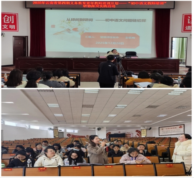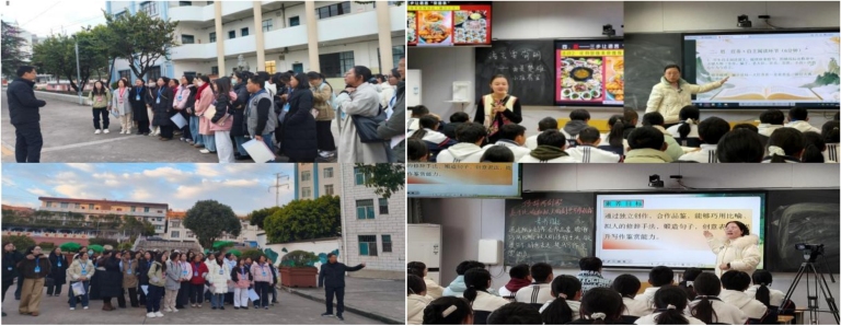 研修活动高效紧凑。活动伊始,我校领导热情迎接参训教师,带领大家参观校园,讲解学校办学历史与文化建设成果。随后,参训教师齐聚录播教室,聆听初中语文教研组的三节公开课:徐菲老师的《语言要简明——我是楚雄小推荐官》,以楚雄特色为情境载体,用多样化任务引导学生掌握写作简明表达的技巧;温艳辉老师的《皇帝的新装》,以“感知—探究—迁移”推进文本解读与实践衔接;彭春梅老师的《修辞两剑客——基于比喻和拟人的创意写作初探》,以趣味案例拆解修辞妙用,指导学生将比喻、拟人手法融入创意写作。活动以理论研修结合跟岗实践的方式,为青年教师搭建学习交流平台,切实提升其课堂教学与育人管理水平。