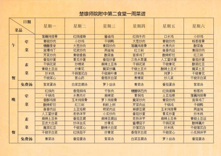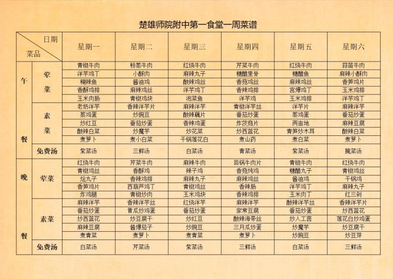 楚雄师院附中食堂一周食谱 2026年1月19日——2026年1月24日