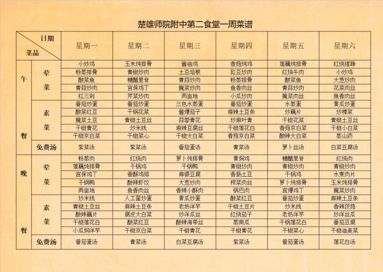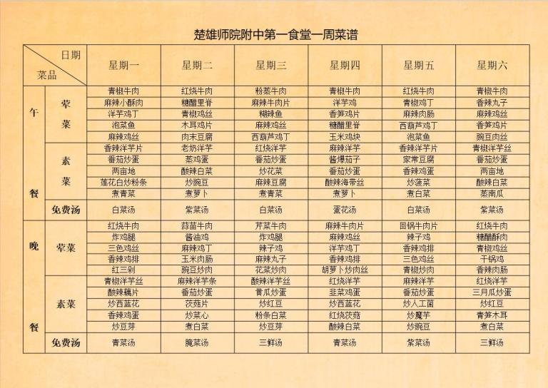 楚雄师院附中食堂一周食谱 2026年1月26日——2026年1月31日
